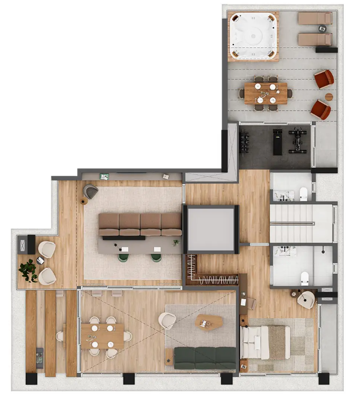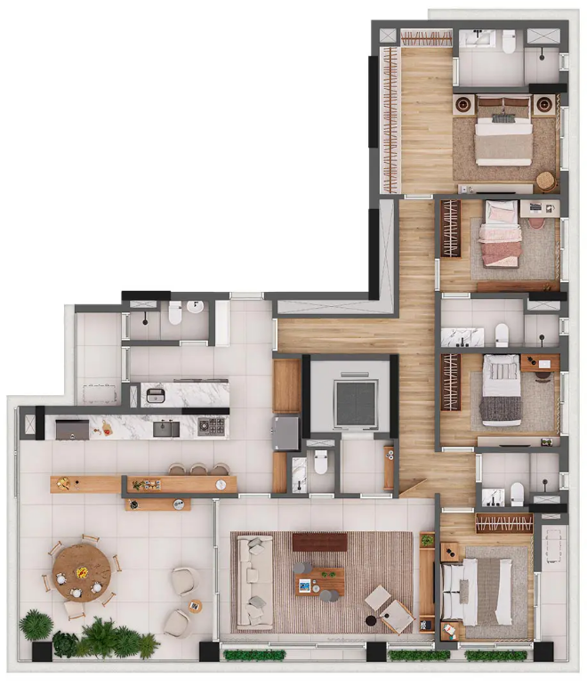 O Lizz Pinheiros valoriza a integração entre arquitetura e natureza, com fachadas ajardinadas e áreas comuns que promovem conforto e bem-estar. O paisagismo, assinado por Rodrigo Oliveira, cria ambientes que se conectam à vegetação urbana, proporcionando harmonia e tranquilidade aos moradores. O empreendimento ainda conta com uma completa infraestrutura de lazer, incluindo piscina com spa e solarium, academia, sauna, lounges para festas e espaço gourmet, área kids, terraço com churrasqueira, além de lobby com jardim e minimarket.
